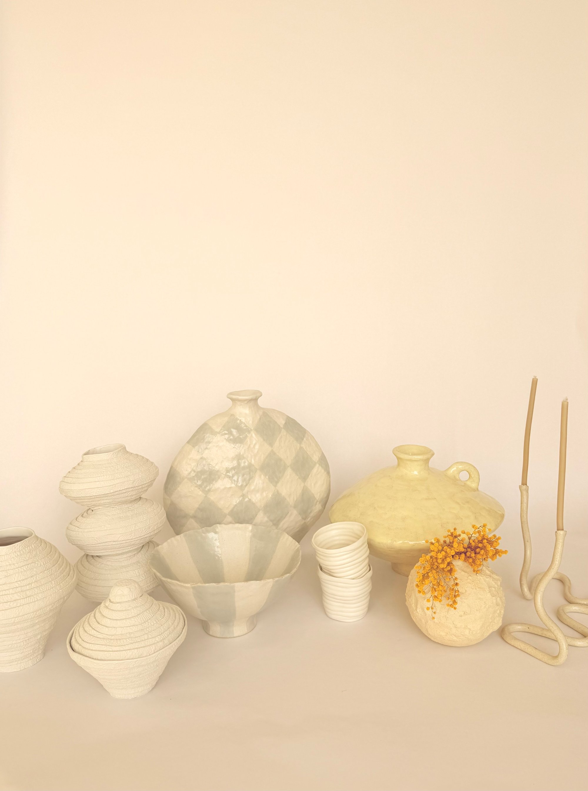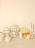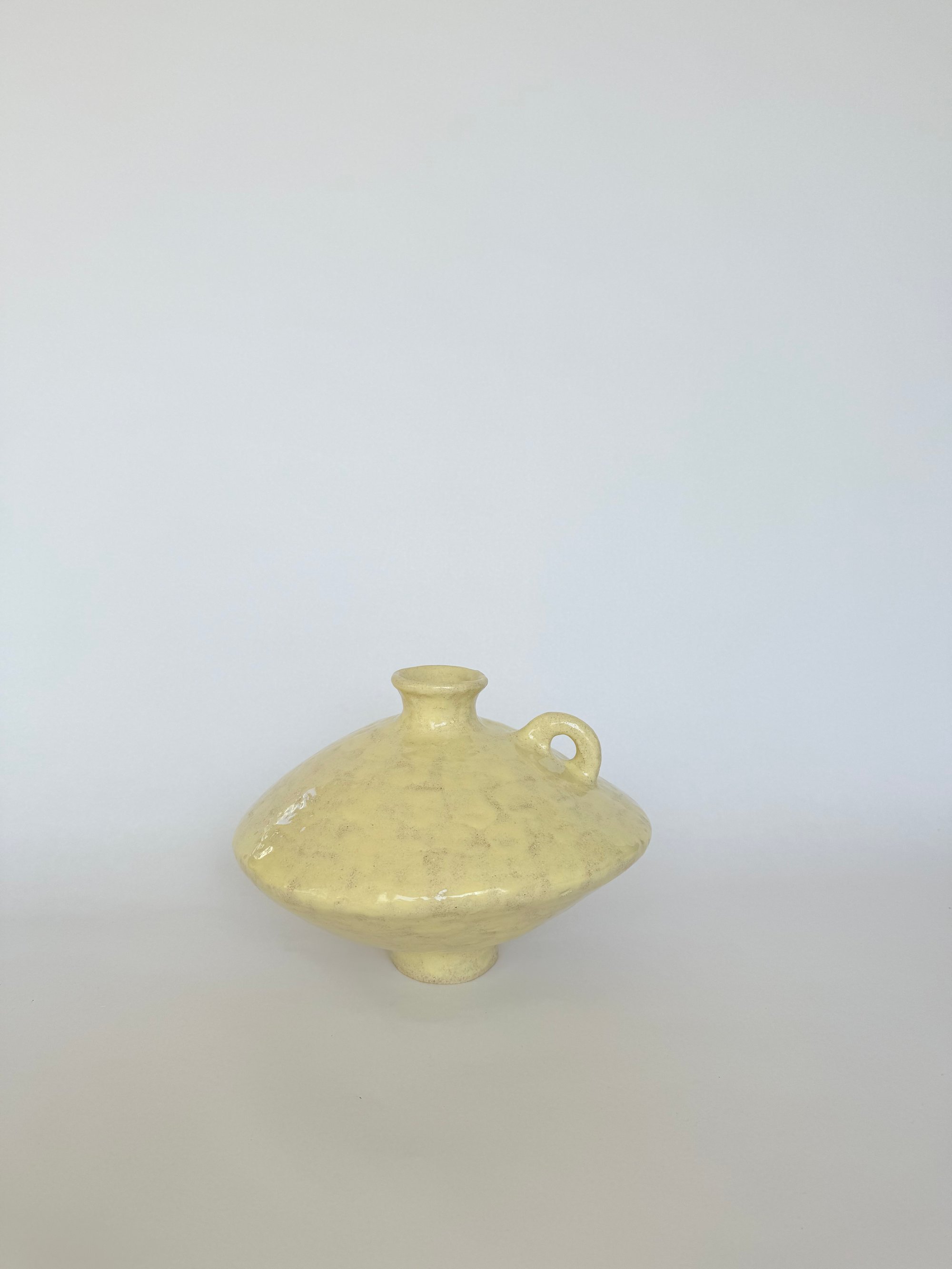 A low, rounded vessel with a softly domed body, tapering into a narrow neck & foot. Finished in a painterly , glossy buttermilk glaze. A statement, sculptural piece to stand alone or for fresh or dried flowers.